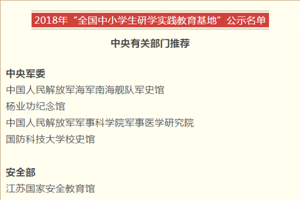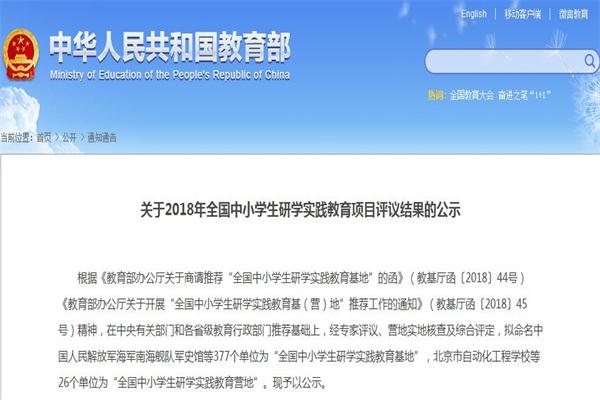 根據(jù)《教育部辦公廳關(guān)于商請(qǐng)推薦“全國(guó)中小學(xué)生研學(xué)實(shí)踐教育基地”的函》(教基廳函〔2018〕44號(hào))《教育部辦公廳關(guān)于開(kāi)展“全國(guó)中小學(xué)生研學(xué)實(shí)踐教育基(營(yíng))地”推薦工作的通知》(教基廳函〔2018〕45號(hào))精神,在中央有關(guān)部門(mén)和各省級(jí)教育行政部門(mén)推薦基礎(chǔ)上,經(jīng)專(zhuān)家評(píng)議、營(yíng)地實(shí)地核查及綜合評(píng)定,擬命名國(guó)家中印科技國(guó)際創(chuàng)新園等377個(gè)單位為“全國(guó)中小學(xué)生研學(xué)實(shí)踐教育基地”,北京市自動(dòng)化工程學(xué)校等26個(gè)單位為“全國(guó)中小學(xué)生研學(xué)實(shí)踐教育營(yíng)地”。