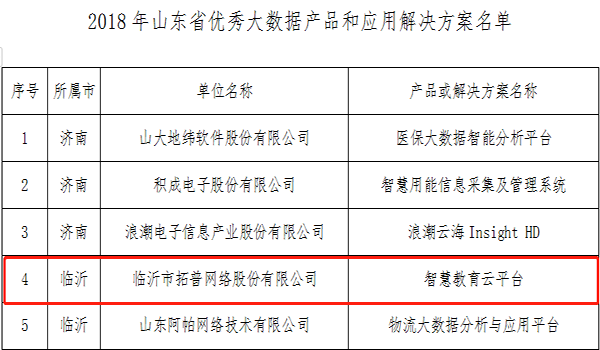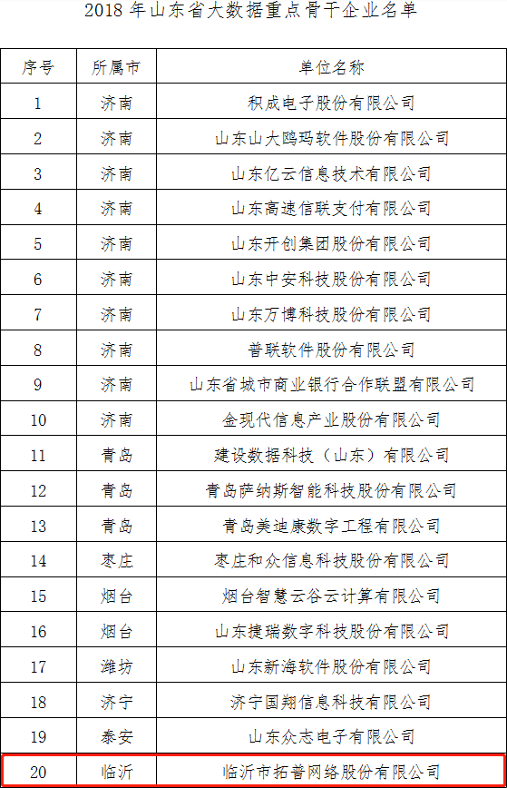 近日,山東省工業和信息化廳發布《2018年山東省大數據產業集聚區、大數據重點骨干企業、優秀大數據產品和應用解決方案公示》。該公示公布了臨沂市拓普網絡股份有限公司在內的20家2018年山東省大數據重點骨干企業和40家2018年山東省優秀大數據產品和應用解決方案名單以及臨沂市大數據產業集聚區在內的4個2018年山東省大數據產業集聚區名單。