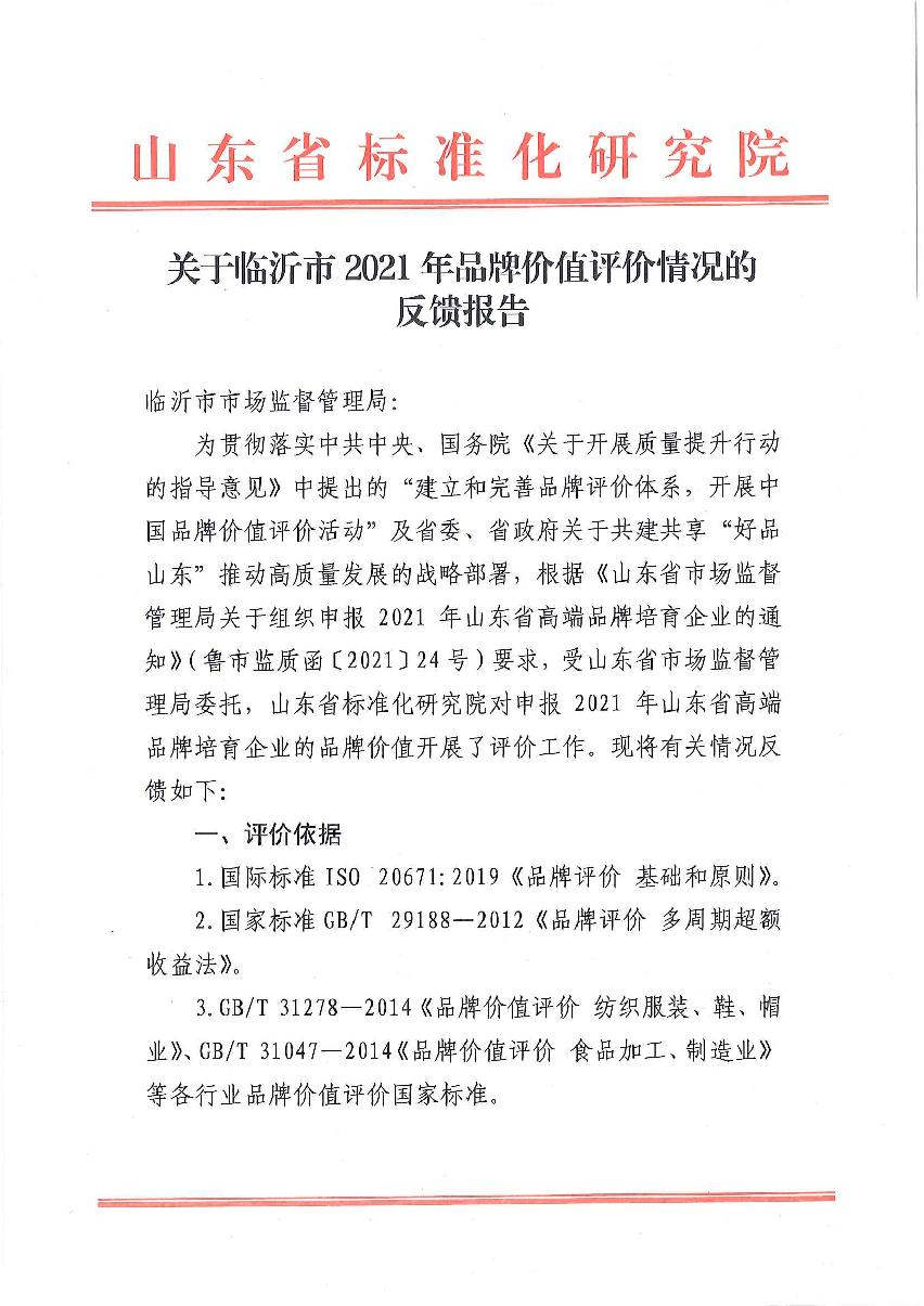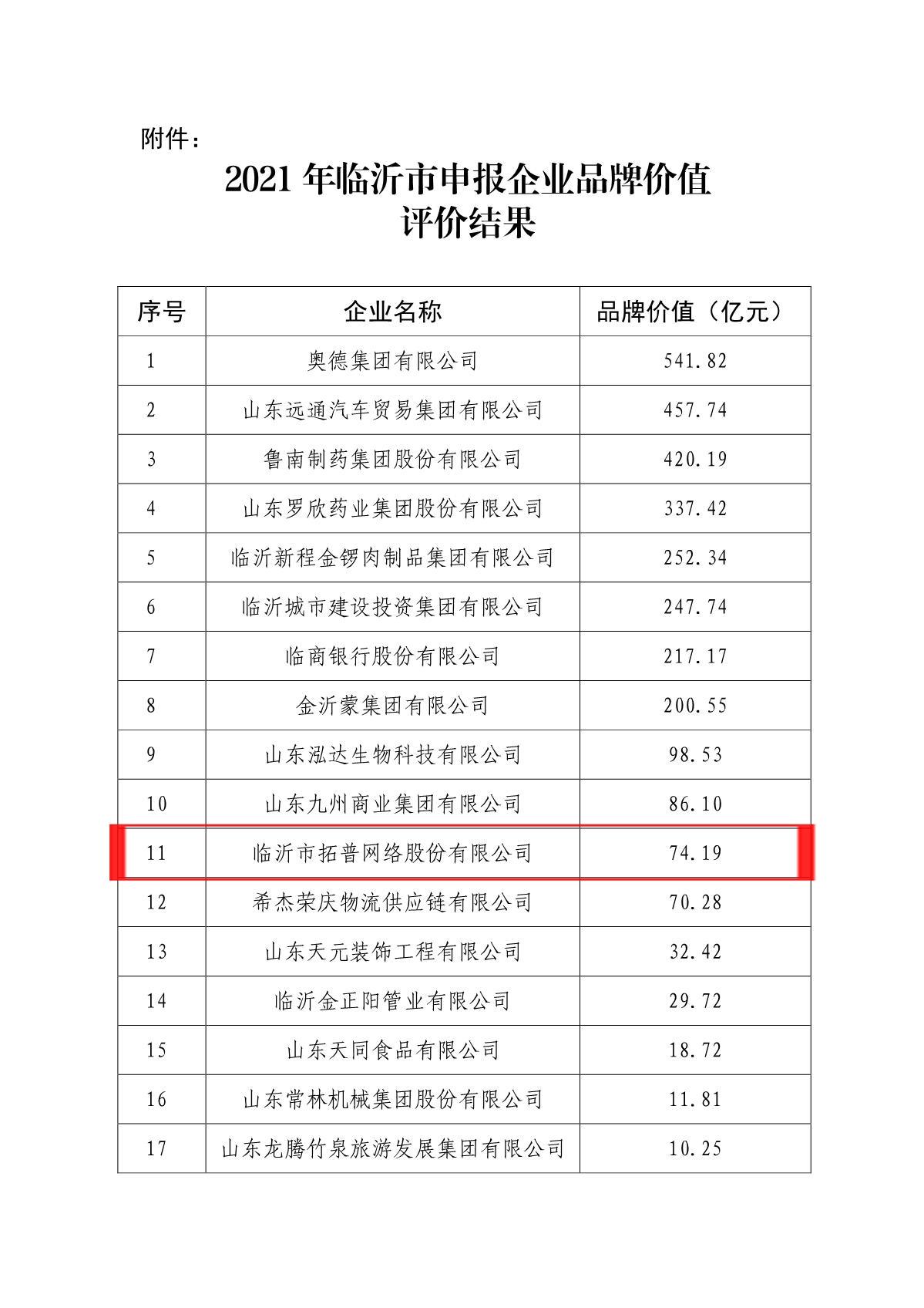 2021年5月19日,山東省標(biāo)準(zhǔn)化研究所公布了對(duì)臨沂市65家企業(yè)品牌價(jià)值的評(píng)價(jià)反饋報(bào)告。依據(jù)企業(yè)財(cái)務(wù)數(shù)據(jù)和各項(xiàng)綜合指標(biāo),統(tǒng)籌結(jié)合相關(guān)行業(yè)主管部門(mén)、金融數(shù)據(jù)庫(kù)、信用信息平臺(tái)、輿情檢測(cè)平臺(tái)等大數(shù)據(jù)信息,從企業(yè)有形資產(chǎn)、質(zhì)量、創(chuàng)新和服務(wù)等多個(gè)維度綜合評(píng)價(jià)測(cè)算企業(yè)品牌價(jià)值,臨沂市拓普網(wǎng)絡(luò)股份有限公司的品牌價(jià)值已達(dá)74.19億元。