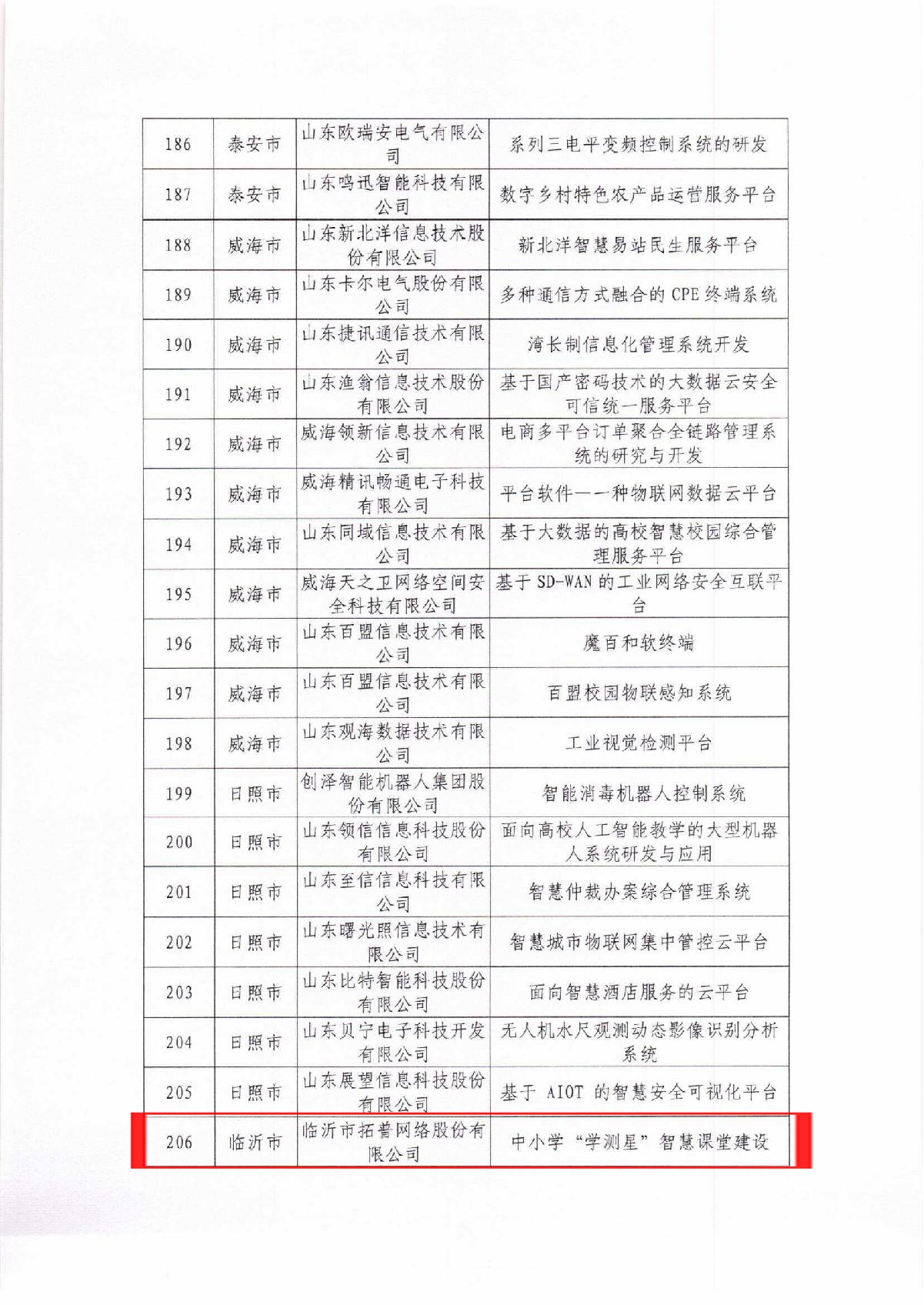 2021年6月2日,山東省工信廳公布了山東省軟件產業高質量發展重點項目名單,臨沂市拓普網絡股份有限公司的中小學“學測星”智慧課堂建設項目入選。