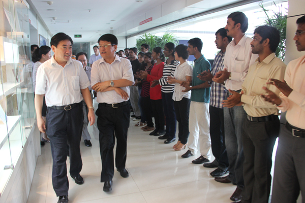 8月29日,市委常委、常務副市長左沛廷帶領全市重點項目建設推進現(xiàn)場會與會人員來臨沂經(jīng)濟開發(fā)區(qū)參觀考察,并到臨沂市拓普網(wǎng)絡有限公司視察指導工作,臨沂經(jīng)濟開發(fā)區(qū)黨工委副書記、管委會副主任鄒際國陪同。 拓普網(wǎng)絡公司總經(jīng)理王嵐保向左沛廷市長一行詳細介紹了公司“中印軟件產(chǎn)業(yè)園”的籌備建設情況、以及引進印度籍專家40余人的工作生活情況,并對公司的發(fā)展狀況、研發(fā)項目和發(fā)展前景做了重點匯報。 左沛廷市長一行參觀了公司的榮譽墻,對拓普網(wǎng)絡公司在物聯(lián)網(wǎng)、智能化系統(tǒng)研發(fā)取得多項自主知識產(chǎn)權專利證及獲得中國國際博覽會金獎等研發(fā)成果給予了高度評價,對拓普網(wǎng)絡公司的發(fā)展狀況給予了充分肯定,對于引進40余名印度籍專家的做法表示高度認可。 左沛廷市長表示,能一次性引進這么大規(guī)模的印度籍專家,這在全市乃至全省都是第一次,利用外國先進的研發(fā)理念和技術,來促進成果轉化,這對臨沂市軟件行業(yè)的發(fā)展會有很大的推動作用。同時,左沛廷市長指出,“中印軟件產(chǎn)業(yè)園”要盡快建設爭取早日投入運營,市委、市政府將一如既往的大力支持高新企業(yè)的發(fā)展,支持重點項目的建設。