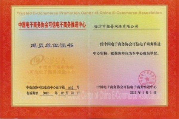 2012年1月1日,我公司經中國電子商務協會可信電子商務推進中心審核批準為成員單位。 中國電子商務協會可信電子商務推進中心主要由全國電子商務行業為主體的企事業單位及相關管理人員、專家、學者共同組成,是一個行業性的全國性的非營利性的社會組織。秘書處設在北龍中網(北京)科技有限責任公司。主要以研究和建立電子商務誠信長效機制,推進電子商務誠信體系建設,構建安全可信的電子商務基礎運營設施,督促和引導電子商務企業誠信經營,共同營造和維護誠信文明的電子商務環境,推動電子商務行業健康和諧發展為宗旨,定期發布可信電子商務報告、定期舉辦“電子商務誠信論壇”及行業沙龍和推動可信電子商務示范城市等工作。 公司成為中國電子商務協會可信電子商務推進中心成員單位,標志著公司在取得“可信網站驗收證中心”的基礎上,將可信電子商務理念上升到國家層面,引導電子商務的發展正式進入可信時代。