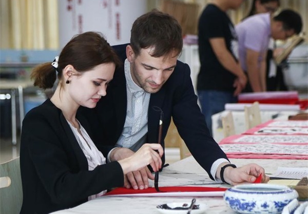 5月12日,在山東省臨沂市拓普網絡股份有限公司書畫院,來自烏克蘭的瑪麗娜(左一)與男朋友亞歷山大一起練習中國書法。二人于2014年來到山東省臨沂市拓普網絡股份有限公司工作。