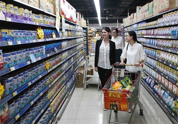 5月12日,在山東省臨沂經濟技術開發區東方購物超市,瑪麗娜(左一)與同事劉相艷(右一)一起購物。來自烏克蘭的瑪麗娜于2014年來到山東省臨沂市拓普網絡股份有限公司工作。