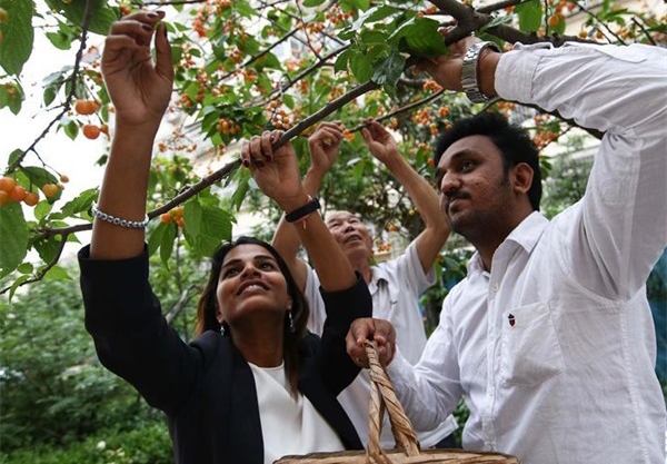 5月11日,在山東省臨沂經濟技術開發區芝麻墩街道西朱汪社區,維格尼斯(右)和妻子卡奧帕娜在采摘櫻桃。二人于2015年來到臨沂市拓普網絡股份有限公司工作。