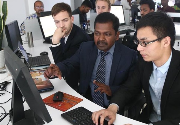 5月12日,在山東省臨沂市拓普網絡股份有限公司,巴布(右二)與中國同事張震超(右一)討論技術課題攻關。來自印度的巴布是計算機研發管理專家,2011年來到山東省臨沂市拓普網絡股份有限公司工作。