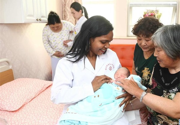 5月12日,在山東省臨沂市第三人民醫院,婦產科醫生墨賓(左三)與新出生的嬰兒瑞瑞及其家人在一起。她的丈夫巴布是計算機研發管理專家,2011年來到山東省臨沂市拓普網絡股份有限公司工作,2016年墨賓帶著女兒來到臨沂定居。
