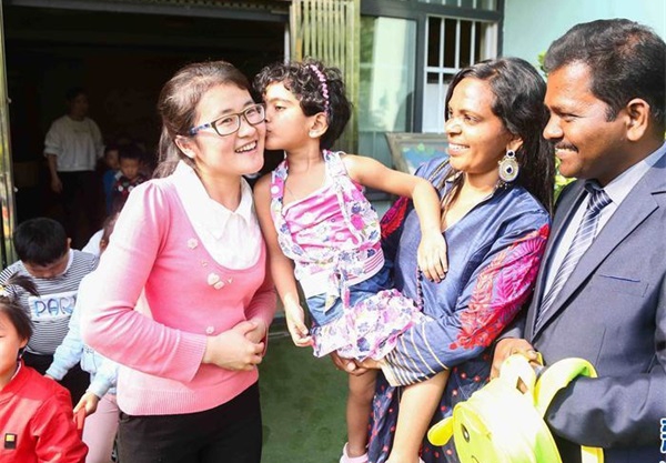 5月12日,在山東省臨沂經濟技術開發區協和幼兒園,5歲的印度小朋友黛芬娜(右三)親吻老師。她的父親巴布(右一)是計算機研發管理專家,2011年來到山東省臨沂市拓普網絡股份有限公司工作,2016年黛芬娜隨母親墨賓(右二)來到臨沂定居。 為積極融入“一帶一路”戰略,位于山東省臨沂市經濟技術開發區的國家中印科技國際創新園引進印度、烏克蘭、俄羅斯、捷克等國家的高層次人才,開展云計算、大數據、軟件技術、智能機器人、傳感器等領域的專業研究,這些因項目合作而結緣臨沂的外國專家,如今已融入當地,在臨沂展開了自己的幸福生活。新華社發(尹召功 攝) |