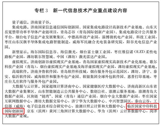 我省新舊動能轉換重大工程實施規劃中指出要發展新興產業培育形成新動能,要發展新一代信息技術產業,內容包括量子通信、集成電路、新型顯示、虛擬現實、高端軟件、大數據與云計算。其中“臨沂國家中印科技國際創新園”以其在大數據與云計算方面的顯著優勢被列入新一代信息技術產業重點建設內容。