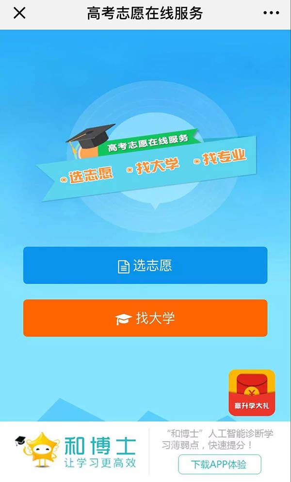 贏取25萬助學金 和博士在教育行業深耕多年,在幫助學生們提高成績,全面發展的路上,有著和每個考生同樣的心態——堅信努力就會有回報。為服務考生,助力高考,和博士特別推出高考季活動,不僅為考生們提供高考志愿免費在線服務,還為廣大考生準備了25萬元的助學金。 通過和博士教育公眾號點擊『高考志愿』-『贏助學金活動』-『我要參加』就有機會領到25萬助學金,快來參加活動吧! ![]()