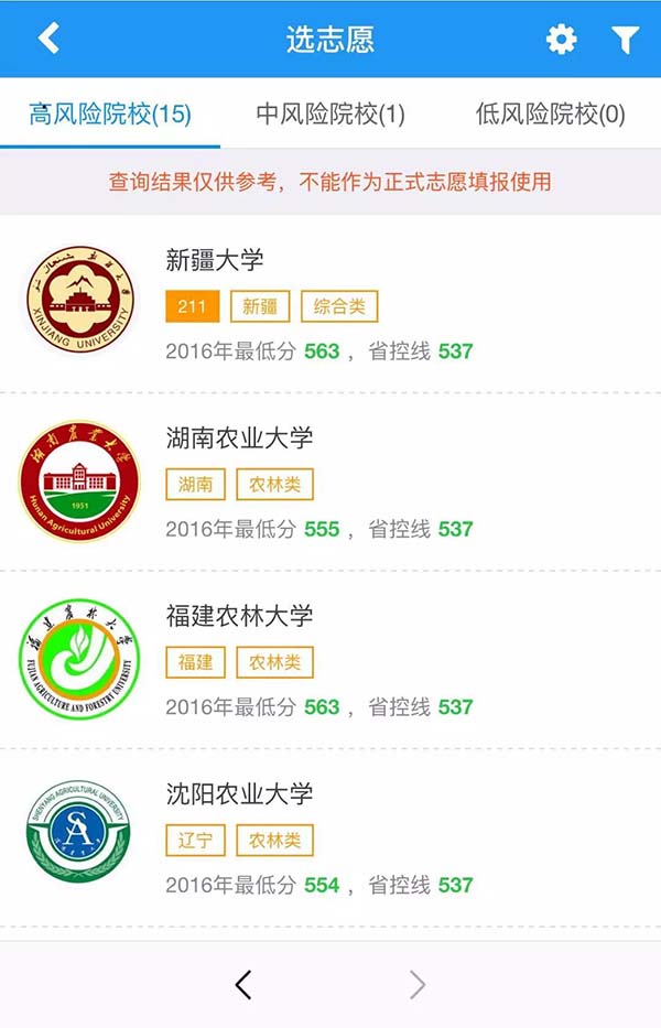 在和博士高考志愿在線服務系統當中,點擊『選志愿』輸入分數等信息就可以獲得系統為您預測的學校。分為高風險,中風險和低風險院校。
