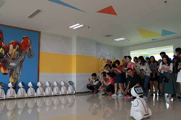(記者團參觀高科技互動體驗區) 記者團一行跟隨園區工作人員先后參觀了一樓展廳內的研發中心、臨沂市大數據中心、創客教育實踐基地、山東省智慧教育創客活動中心高科技互動體驗區和綜合實踐區等地,工作人員向記者們詳細介紹了拓普網絡股份有限公司發展現狀、所獲榮譽、園區入駐企業、智慧教育云平臺建設運營等基本情況,并向記者們描繪了園區關于未來對臨沂智慧城市的構想。