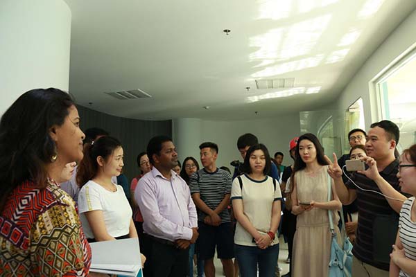 (記者團與印度員工交流) 記者團一行還與園區內的印度專家巴布等人展開了親切友好的交流,巴布是公司的部門副總,在臨沂結婚生子、工作生活已有7年。他向記者們介紹到:“這里生活環境好,人民熱情,經濟發展飛快,政府支持力度大,現在越來越多印度人想要來中國發展。”