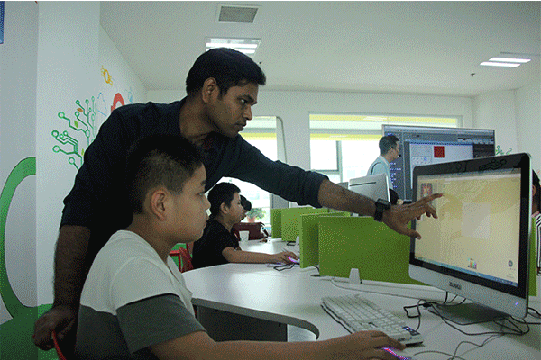 隨后,小朋友們在園區綜合實踐區進行了本期夏令營的研學創客課程,他們在園區印度專家的指導下學習編程,“編玩邊學”,在純英文交流的環境下嘗試編寫游戲程序,從游戲玩家變成游戲開發者。除了編程課堂,小朋友們還通過課堂學習了解了各項機器人知識和蘊含在鳥翼中的空氣力學知識,嘗試動手制作機器人和鳥翼模型飛機,并與園區內的智能機器人展開互動,體驗智能機器人內置的各項功能。充實愉快的研學創客課程在小朋友們集中展評自己動手制作的機器人、飛機模型等作品中結束,一天一夜的課程雖然短暫,卻讓小朋友們收獲了快樂,開拓了視野,對正在蓬勃發展的創客教育有了一定了解。