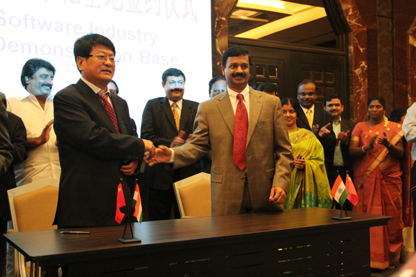 在會議上,公司總經(jīng)理王嵐保與SRM集團總裁瑪尼瓦納、SRM Learning Tree公司總經(jīng)理拉克西米簽訂“中印軟件產(chǎn)業(yè)園協(xié)議”和“中印高端人才合作協(xié)議”,并舉行了隆重的國際(中?。┵Q(mào)易網(wǎng)開通儀式。