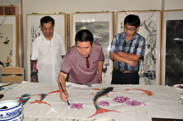 9月20日,中國美術家協會會員、佛山市美術家協會理事、著名國畫家謝桂森一行蒞臨拓普書畫院。在畫院創作室,謝桂森揮毫潑墨不吝才華,創作了多幅佳作,還與畫院副秘書長孫太東聯合創作《富貴有余》,博得觀者一片好評。在參觀館藏作品時,謝桂森對畫院的收藏水平大加贊揚,并對“全國名家中國畫作品邀請展”給予了高度評價。此后,謝桂森一行前往臨沂各名勝古跡觀光采風,了解臨沂厚重歷史、飽覽臨沂秀美風光,迸發創作激情。