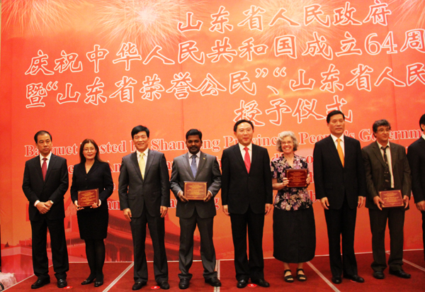 9月29日,中華人民共和國成立64周年招待會暨“山東省榮譽公民”“山東省人民友好使者”授予儀式在濟南舉行,副省長夏耕出席并致辭,并對10位獲得“山東省榮譽公民”和30位獲得“山東省人民友好使者”榮譽稱號的外國友人進行了表彰,公司印度專家BABU先生被授予“山東省人民友好使者”稱號。 ![]() 頒獎現場 ![]() 山東省人民友好使者證書