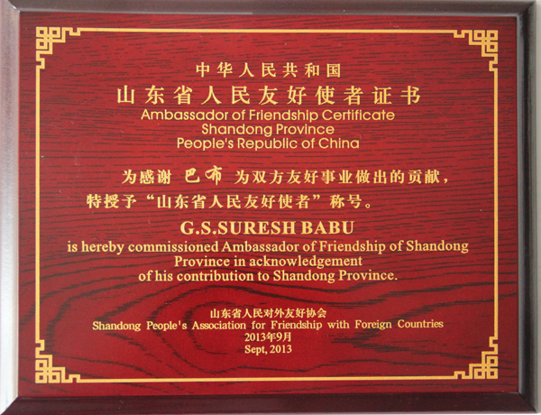 熱烈祝賀公司印度專家BABU榮獲“山東省人民友好使者”稱號 |