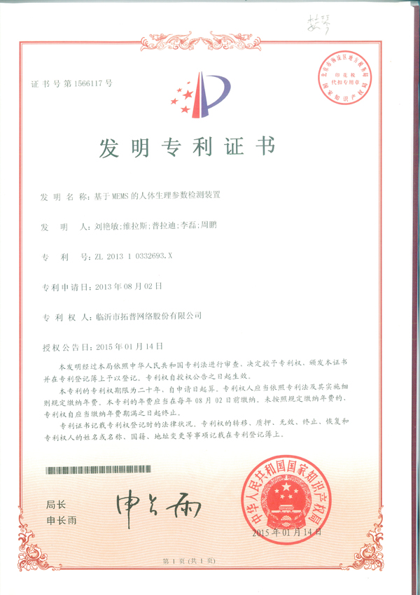 2015年1月14日,公司申請的發(fā)明專利《基于MEMS的人體生理參數(shù)檢測裝置》由國家知識產(chǎn)權(quán)局正式授權(quán)公告,標(biāo)志著公司研發(fā)水平又提到一個新層次。