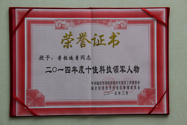 2015年3月9日,臨沂經濟技術開發區領導干部大會隆重召開,市人大常委會副主任、開發區黨工委書記徐福田出席會議并作重要講話,大會表彰了2014年創業功臣、功勛企業、科技創新先進單位等先進個人、先進集體,其中,公司印度專家普拉迪普榮獲“十佳科技領軍人物”。