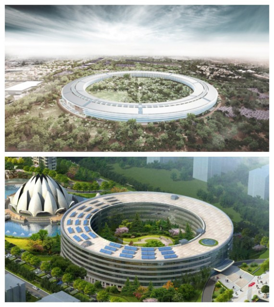 蘋果公司正在其加州總部附近建設名為“太空船”的新園區大樓,這個引領世界科技潮流的公司展示給世界的“最具科技感”建筑,卻被眼尖人士發現它和我公司建設的中印軟件產業園極為神似。